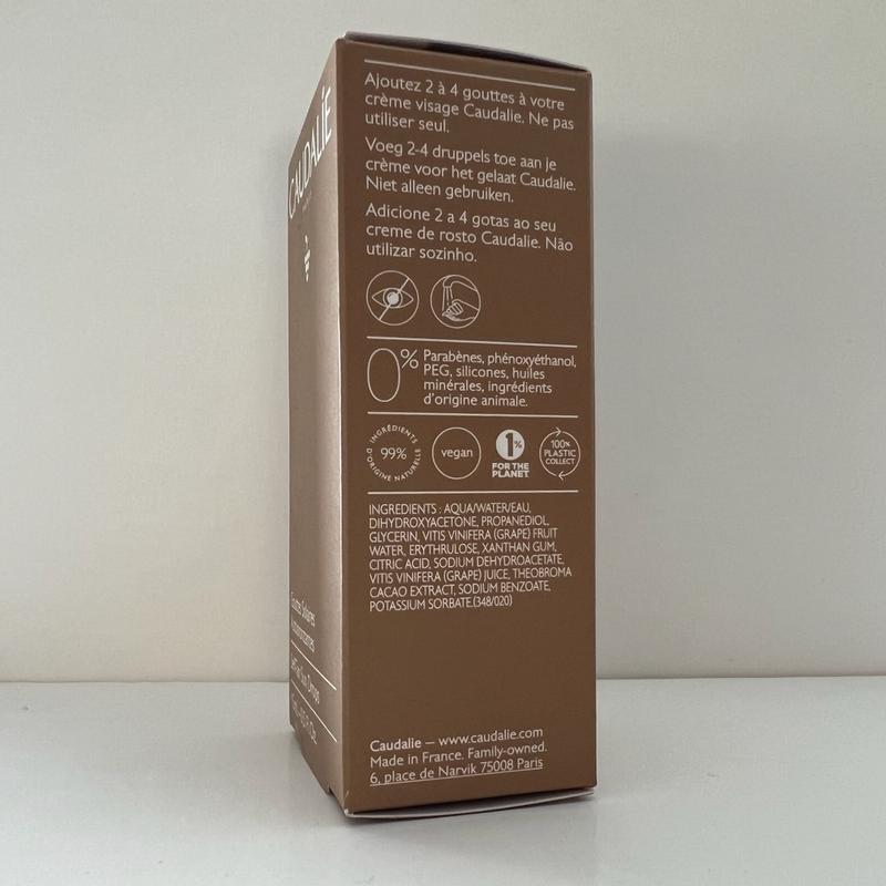 AQUA/WATER/EAU, DIHYDROXYACETONE, PROPANEDIOL, GLYCERIN, VITIS VINIFERA (GRAPE) FRUIT WATER, ERYTHRULOSE, XANTHAN GUM, CITRIC ACID, SODIUM DEHYDROACETATE, VITIS VINIFERA (GRAPE) JUICE, THEOBROMA CACAO EXTRACT, SODIUM BENZOATE, POTASSIUM SORBATE.(348/020)